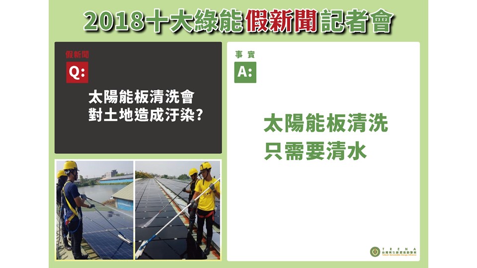 映發科技股份有限公司總經理李喆龍表示,太陽能板的確在晶圓製程時雖會有污染的問題,但如同一般半導體應用在手機、3C產品上,一旦製成成品就不會對人體及環境造成影響。而且太陽能板的製程,連3C產品製造步驟的一半都不到,為什麼會被當作有毒的?如果3C被歸類為可回收,為什麼太陽能板卻被汙名化成不可回收的?所以需要的是監督工廠的廢水處理。台灣的太陽能板一向都輸出到歐美對產品檢驗標準甚高的國家,也都符合德國TUEV、歐盟REACH與RoHS的標準。 l 假新聞:太陽能板清洗會對土地造成汙染?