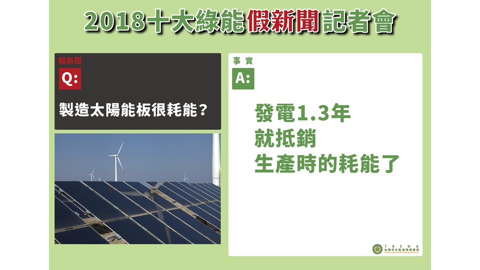 立法委員陳曼麗委員表示,推廣再生能源應該是我們的目標,也希望再生能源可以成為台灣的一個產業,但現在網路上有很多假新聞,有一些媒體可能也不是很了解,所以會有錯誤引用。之前有假新聞提到製造太陽能板的耗能很高、不是環保的能源,關於這個問題,綠色和平《中國光伏產業清潔研究報告》分析,平均太陽能板發電約1.3年所產生的能源便可以抵銷生產時造成的能源消耗。若以太陽能板壽命長25年計算,發電過程中就有超過20年是零碳排放。換另一角度看,太陽能板發一度電的平均碳排放約33至55克,煤的碳排放是797克,雖天然氣較煤清潔,但碳排放仍高達377克,可見太陽能在眾多能源選擇中是真正的低碳能源。 l 假新聞:太陽能光電有汙染之虞?