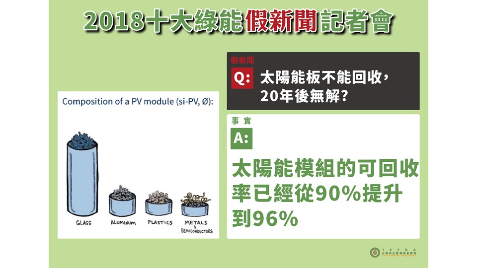 台灣瑞曼迪斯股份有限公司總經理戴英傑表示,太陽能板的回收在技術上已經沒有問題了,可能會有的問題,應該是在經濟層面,過去德國有考慮到回收機制,但這幾年矽的價值不是很好,所以才會有一些狀況。台灣的回收一直都很強,過去寶特瓶是17塊再回收,現在是4塊,台灣已經是最會回收寶特瓶的國家,希望台灣未來是最會回收太陽能板的國家。歐洲非營利組織 PV cycle協會表示現今技術矽晶太陽能板的可回收率可從90%提升至96%,不僅將回收的材料回到原物料循環,無法回收的物質也直接被轉換為能源,完全體現了循環經濟的價值。環保署已在制定回收體系,經濟部能源局也訂定太陽光電模組商要預先負擔太陽能板回收基金。 l 假新聞:光電埤塘因施工將埤塘排水是浪費水源?