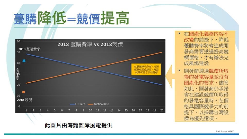 高茹萍表示,5.8塊是已經包含國產化、在地化、帶動綠能產業鏈的成本,現在台灣對於離岸風力所需要的水文資料、基礎建設都很陌生的情況之下,業者前期需要大量的設置成本、開發成本,亦需扣除迴避成本(台電公司平均發電成本,106年為1.96 元/度),這上兆的花費其實是分攤在20年。而且離岸風電資本前期是由開發商自行投資,政府不涉及資金投資,所以並沒有2兆元全民買單的事實。 l 假新聞:競標價格才2.2,躉購卻費率5.8塊,而且歐洲也是2塊多,台灣政府是不是盤子?