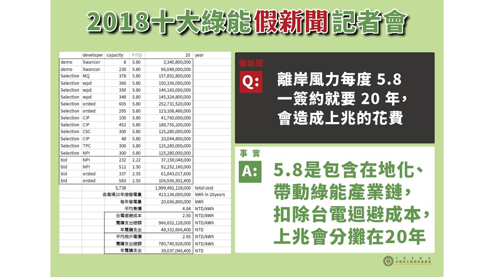 l 事實:5.8是包含在地化、帶動綠能產業鏈,扣除台電迴避成本,上兆會分攤在20年
